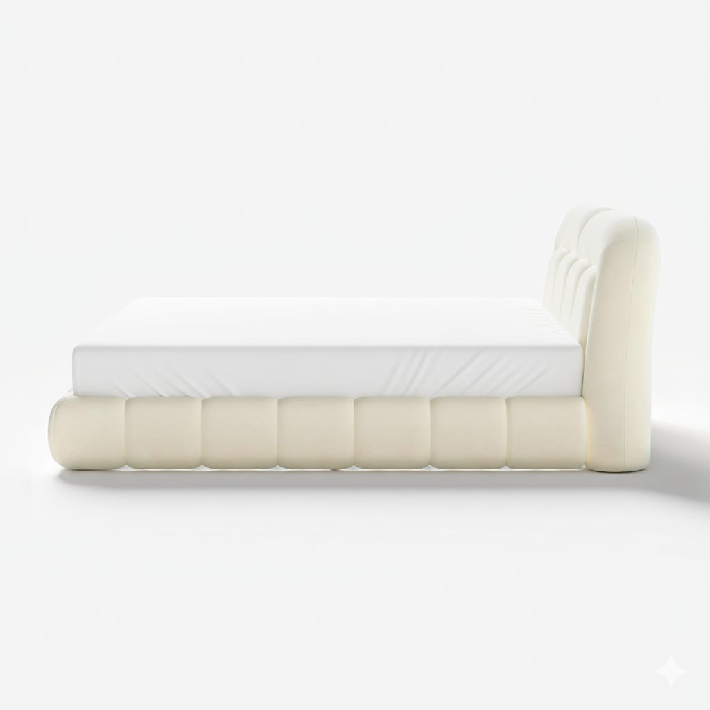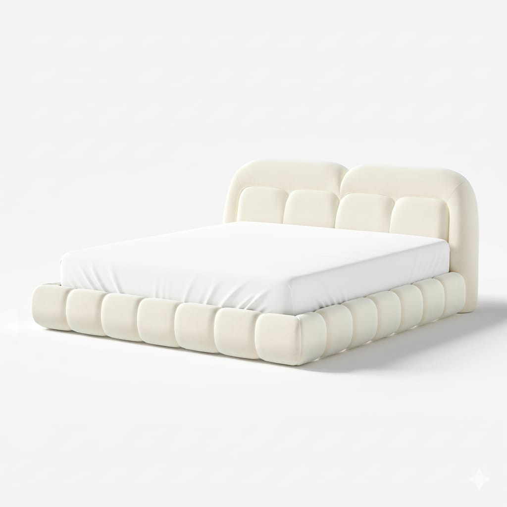 The Cloud Luxe Bed is a modern and sculptural statement piece designed for ultimate comfort and aesthetic appeal. Upholstered in
