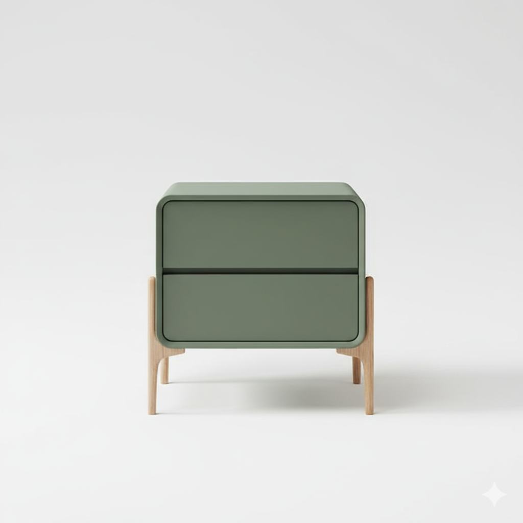 Elevate your bedroom décor with the Modern Curved Edge Nightstand featuring a smooth matte olive green finish and a textured