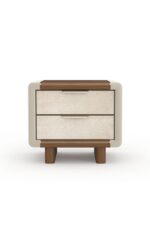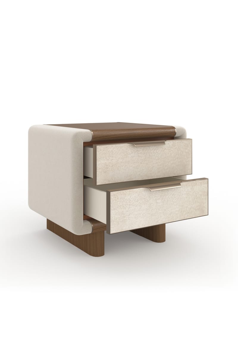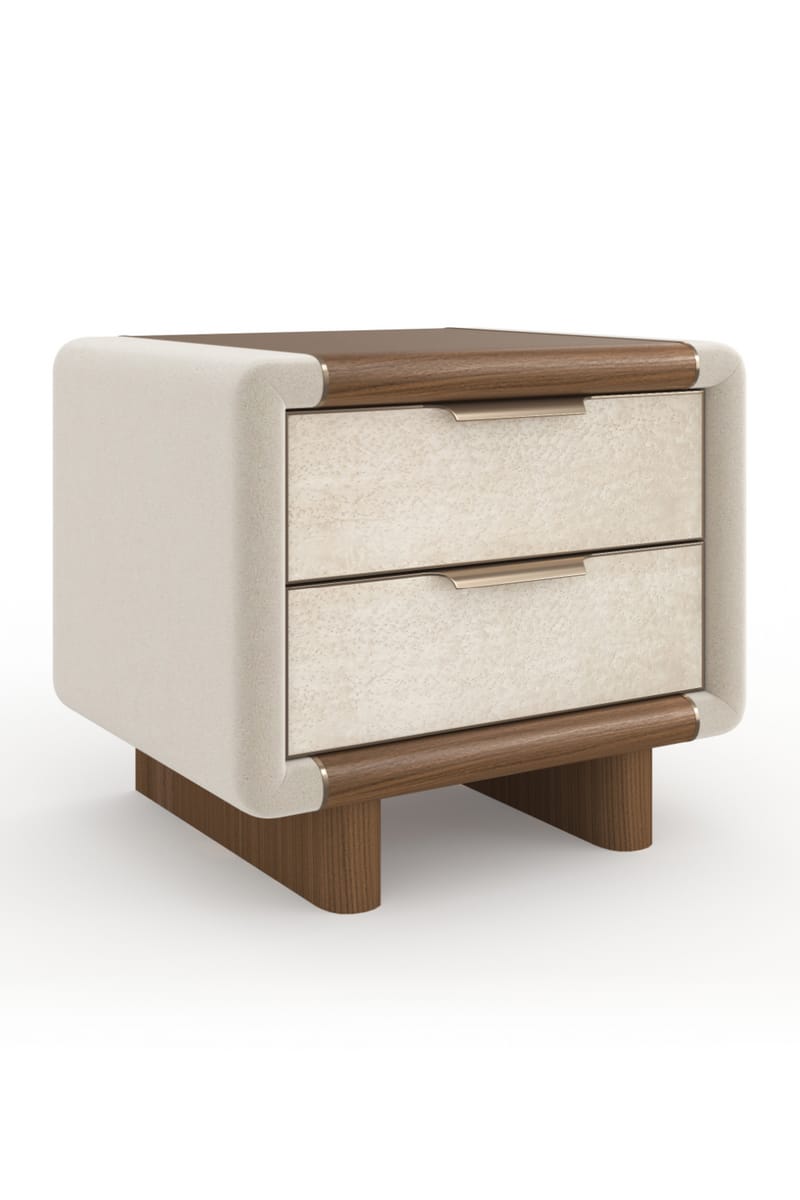 The nightstand features a harmonious contrast of materials, combining a soft, light-toned upholstered or finished body with elegant walnut or dark wood accents along the top and base. Its distinctive rounded edges soften the overall silhouette, contributing to a welcoming and chic aesthetic.